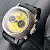 Design dial dinamis dengan fitur chronograph dengan kombinasi warna merah hitam dan putih. Fungsi tanggal ada di antara index 3 dan 4. Keren!